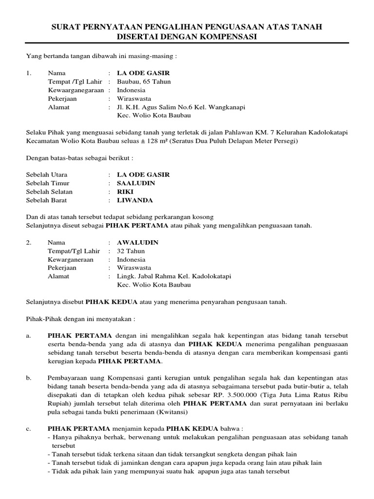 Contoh surat kuasa pengalihan hak tanah Doc Surat Pernyataan Perjanjian Pengalihan Tanah Garapan Imha Febriani Academia Edu